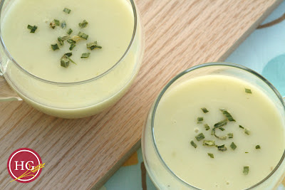 -Working in batches, puree soup in blender transferring to clean pan as you work. Stir in cream. Serve warm or chilled garnished with fresh or dried chives (I prefer the soup warm!)